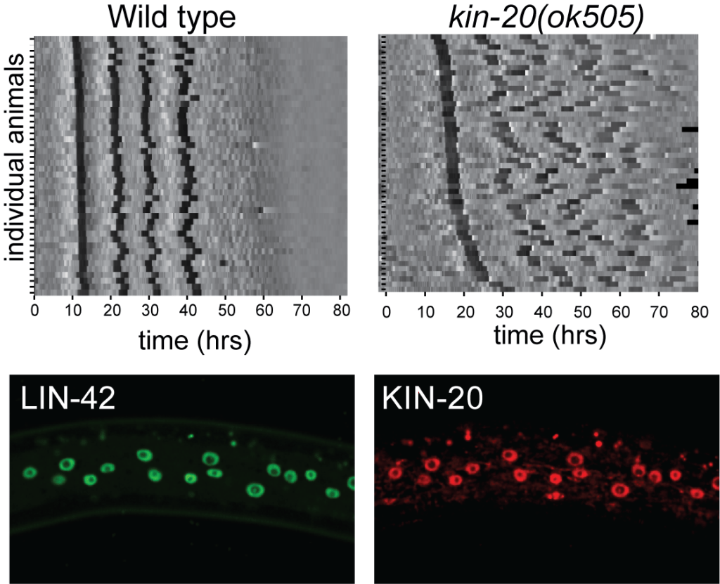What distinguishes the circadian clocks in our bodies (that tell us when to sleep and wake) from clocks that control development? Perhaps not so much: C. elegans LIN-42 and KIN-20 form a stable complex to control developmental tempo just like their orthologues PER and CK1 function in a complex to control the circadian period. Fun in vivo – in vitro collaboration with Ward and Partch labs at UCSC – check out our preprint for the full story.