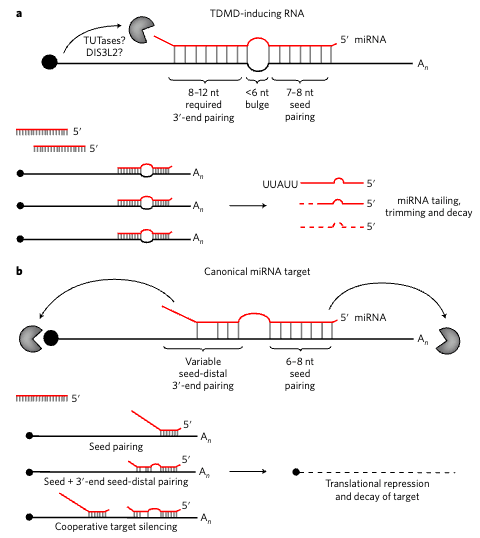 miRNAs control target mRNAs by attaching to partially matching sequences, but some target RNAs can have the opposite effect. In TDMD (target-directed miRNA degradation), binding of miRNAs to RNAs with extensive complementarity leads to miRNA 3′-end tailing, trimming, and loss.
